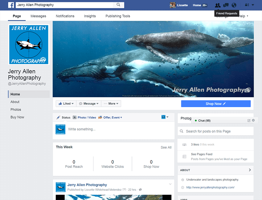 We set up this Facebook business page with a custom logo for world-renowned underwater photographer Jerry Allen. We manage it on an ongoing basis so Jerry can focus on what he does best and delegate social media to an expert. We regularly update it with new photos that engage his audience, increase page likes, and increase sales.
